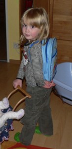 Schon ganz in Schülerinnenpose mit Rucksack, aber leider fehlt noch die Begeisterung.