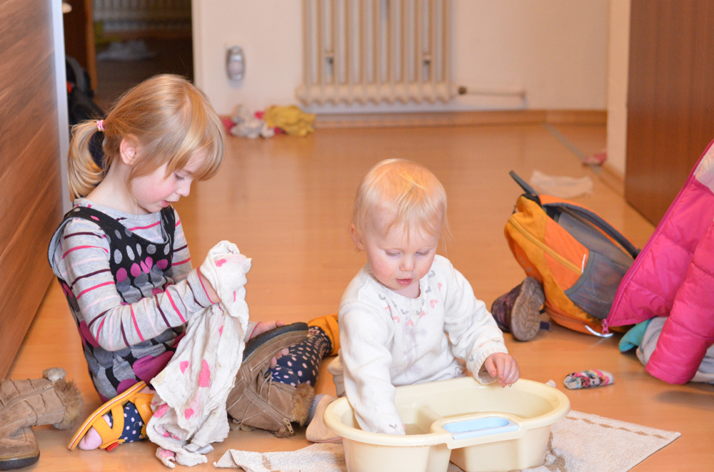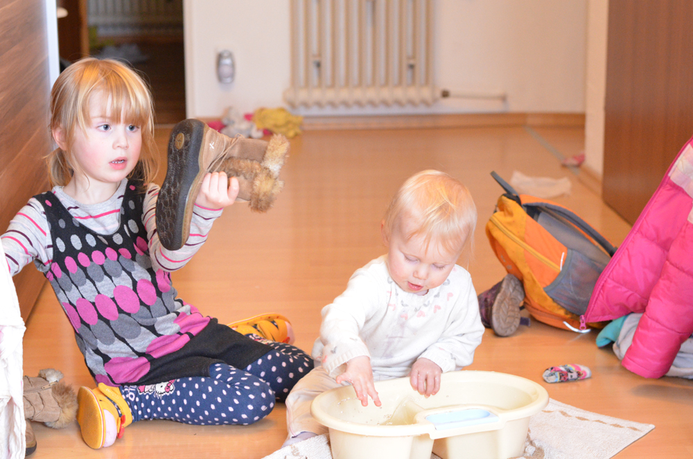 Auch wenn der bayerische Nikolaus das alles bisschen anders kennt, haben wir natürlich am 05.12. abends die Stiefel geputzt. Das heißt, Papa hat geputzt, Jasmin zumindest noch bisschen herumgewischt und Johanna den Vorsaal überflutet. Am Ende standen jedenfalls zwei Paar saubere Stiefel im Haus und der Nikolaus wusste dann auch, was zu tun ist. Morgens haben die beiden Mädels dann noch im Schlafgewand und etwas zerknittert nachgeschaut.