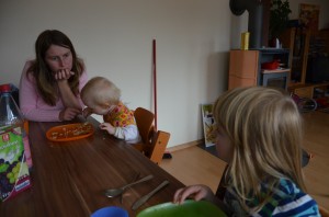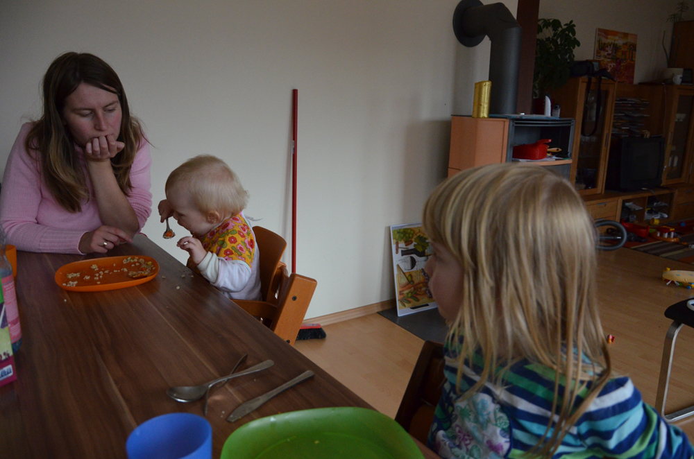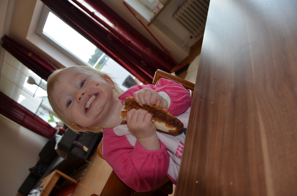 Johanna setzt ihre rasante Entwicklung fort und übernimmt inzwischen ihre eigene Fütterung. Mit voller Konzentration und auch nicht wenig Stolz zittert sie sich Löffel für Löffel ins Mäulchen. Bei ihrer Leibspeise, den Erbsen, ist die Effizienz überschaubar, weil die Dinger, bedingt durch ihre Form, gern vom Löffel rollen, bevor dieser den Mund erreicht. Aber Johanna macht das schon absolut super.