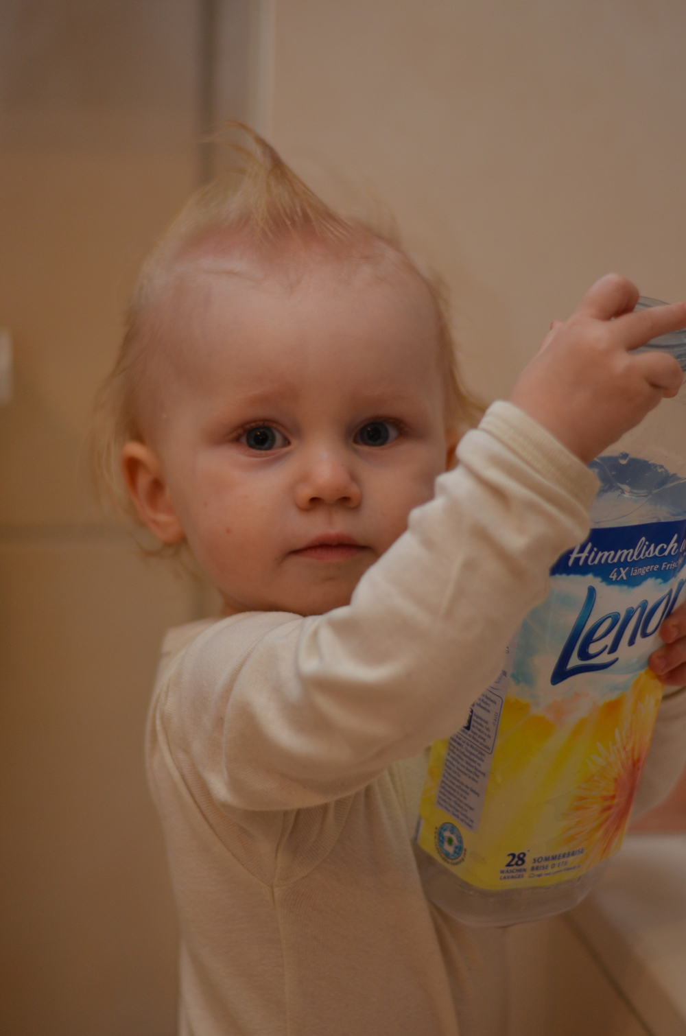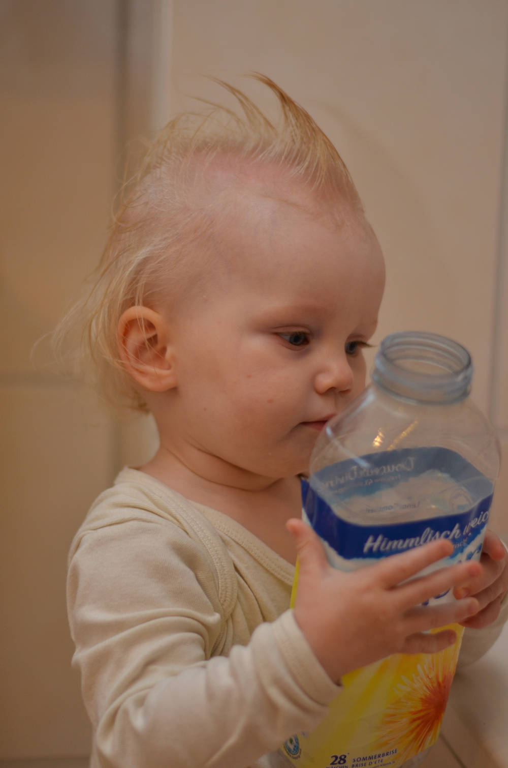Heute wurde endlich die lange geplante Entschorfung des Säugers vorgenommen. Mit reichlich Öl und etwas Geduld hat Mama sämtlichen Schorf herauskämmen können. Zur Ablenkung musste Johanna aber auch etwas geboten werden: sie durfte eine Großpackung Ohrputzer zerlegen – was für eine Freude. Eine ordentliche Sturmfrisur war am Ende der putzige Nebeneffekt.