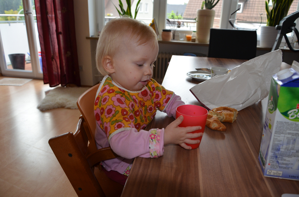 Richtig gut stellt sich Johanna beim Trinken aus dem Becher an. Für Mama und Papa wird das immer weniger zum Nervenkitzel.
