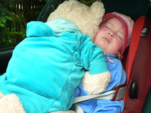 Eigentlich trügt die Überschrift etwas. Denn Jasmin macht keineswegs einen Hehl aus ihren Schlafvorhaben. Bereits vor Fahrtantritt um die Mittagszeit (wir waren wieder mal im Zoo, hatten aber den Fotoapparat vergessen) hat sie die Aktion mit “Tata sch sch” eindeutig angekündigt und dann auch in die Tat umgesetzt. In Dorfhain angekommen hing sie dann mit Paul so in den Seilen.