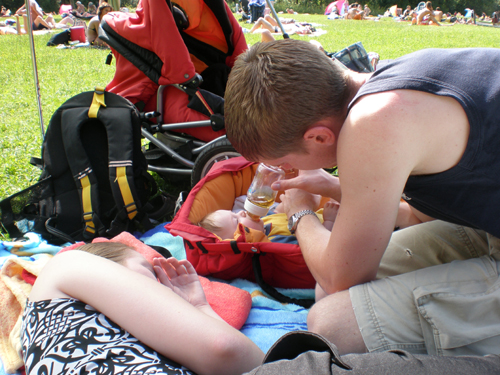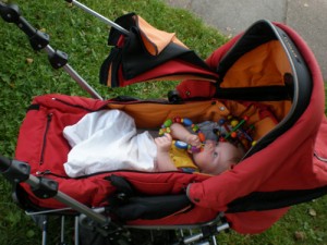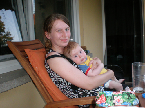 Heute haben wir uns zum zweiten Mal mit Bekannten aus dem Rückbildungskurs getroffen. Da war es dann schon ein ganz schönes Gewusel mit vier kleinen Babys. Alle sind ungefähr im gleichen Alter und zeigten reges Interesse aneinander.