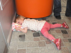Vor lauter Aquarienbestaunerei füllte sich Jasmins Windel wieder rasch, sodass wir im “Ozeaneum” den Wickelraum aufsuchen mussten. Da vor uns, wie sich rausstellte, Zwillinge gewickelt wurden, blieb etwas Wartezeit auf dem Gang, den Minchen samt Wickelunterlage zu einem ihrer gespielten Schlafeinlagen nutzte.