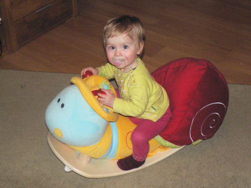 Die Schaukelschnecke, die Minchen von Oma und Opa bzw. vom Weihnachtsmann bekommen hat, ist inzwischen oft im Einsatz.