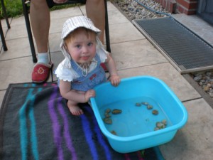 Heute hat Opa die Fußbadwanne rausgeholt, die für Jasmin noch völlig für ein Vollbad ausreichen würde. Nachdem erstmal mit großer Hingabe Steine ins Wasser sortiert wurden, eroberte Minchen dann auch selbst das kühle Nass – zumindest mit den Füßen.