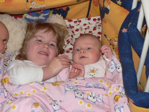 Jasmin mit Menschen- und Babypuppe im Bett: