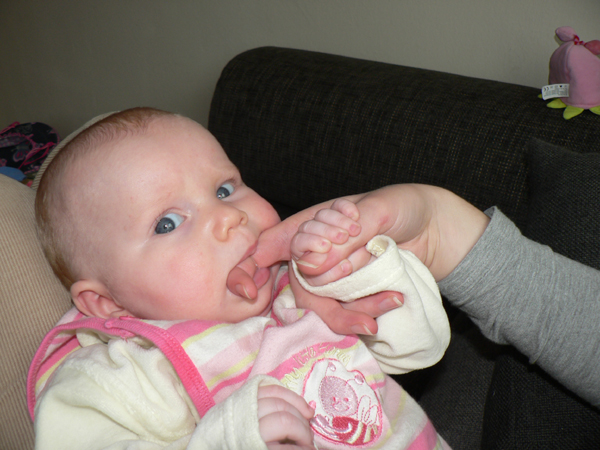 Johanna steckt immer öfter alles Mögliche in den Mund. Besonders gern mag sie “Fleischiges”, sprich Mamas oder Papas Finger, die sie sich schnappt und in ihren Mund schiebt. Dabei kann sie wunderbar schuldbewusst gucken…