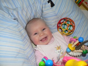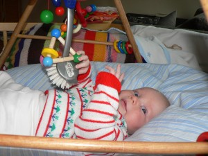 Nachdem man Johanna anfangs so gut wie nie ohne Protest ins Laufgitter legen konnte, findet sie inzwischen zunehmend Spaß an ihrem Spieletrapez und greift immer gezielter nach den aufgehängten Spielsachen.