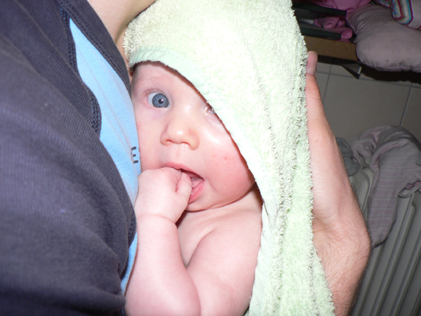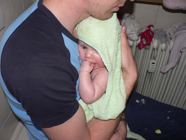 Hier wieder ein paar Badebilder, auf denen Johannas großes Hobby, ihre Hände anknabbern und einspeicheln, deutlich wird.