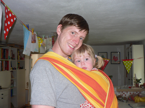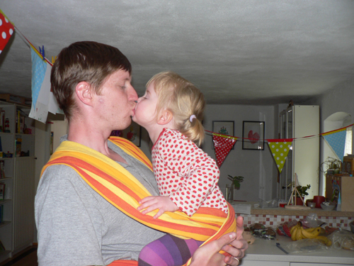 Nachdem Jens und Luise das ausgeliehene Tragetuch zurückgebracht haben, musste unser kleines Baby natürlich nochmal rein, bevor es weggeräumt wurde. Nach gewissen Überlegungen, wie denn die Technik nochmal war, hing das große Mädchen sicher im Stoff und fühlte sich – wenn auch nur kurzzeitig – sichtlich wohl. Jetzt wird das Ding aber bis auf weiteres verräumt, nicht dass da noch was einreißt. 12 Kilo sind eben 12 Kilo.