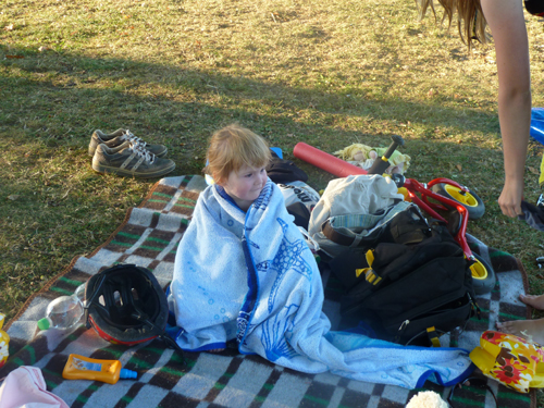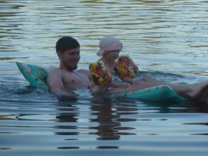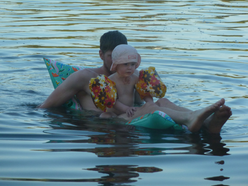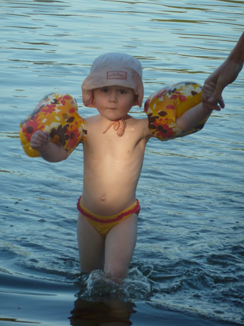 Heute ging es noch einmal an den Badesee, der nach Jasmins Ansicht der Oma gehört. Dort angekommen haben Papa und Jasmin mit den ostalgischen Schwimmflügeln eine Luftmatratzenfahrt über den ganzen See unternommen. Nachdem die Kräftezehrende Enten- Verzeihung: GackGack- verfolgung in der Schilfregion irgendwann aufgegeben werden musste, kehrten wir wohlbehalten zurück an Land. Dick eingekuschelt konnte Jasmin dann Mama und Oma von den Abenteuern berichten.
