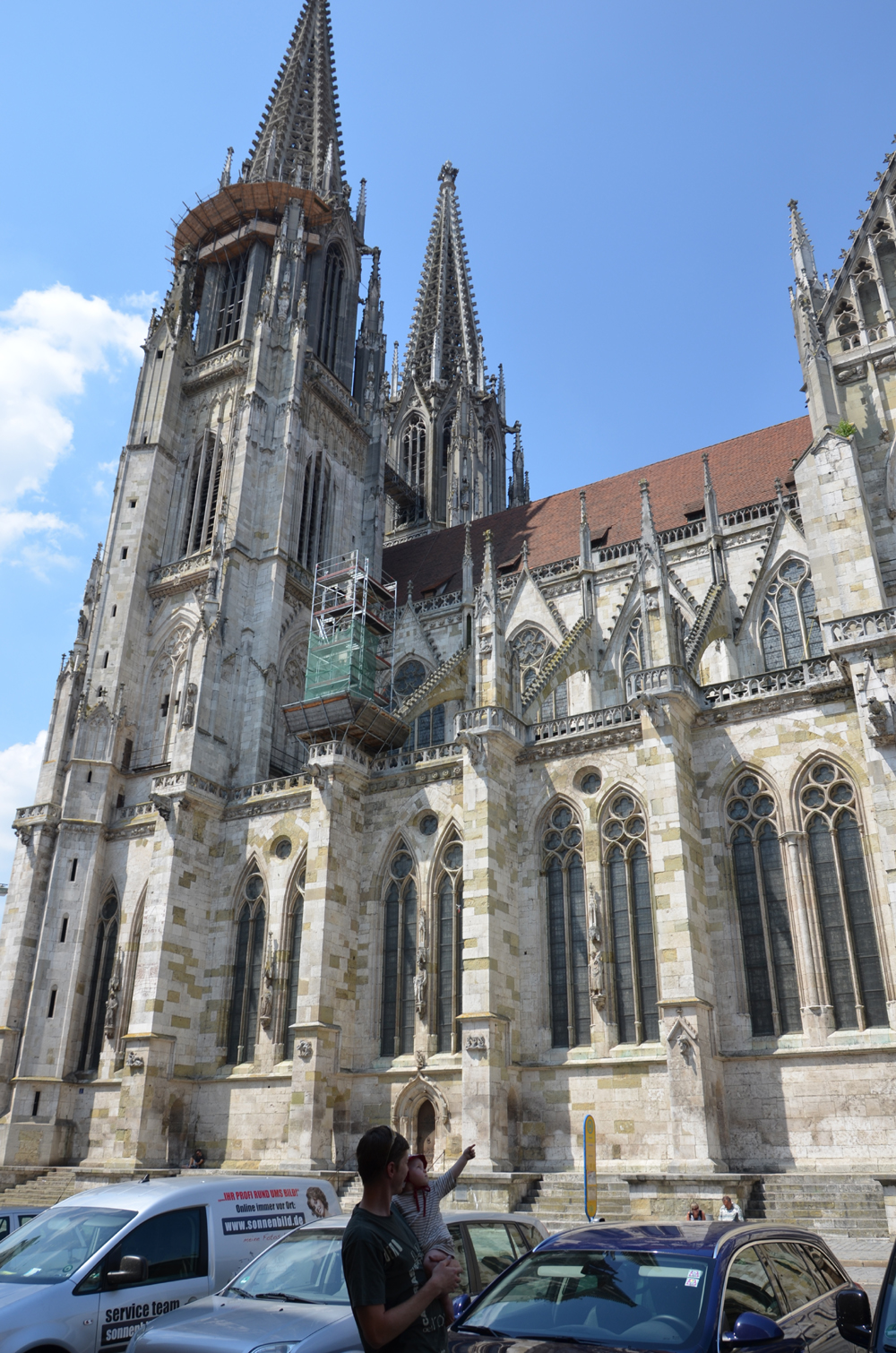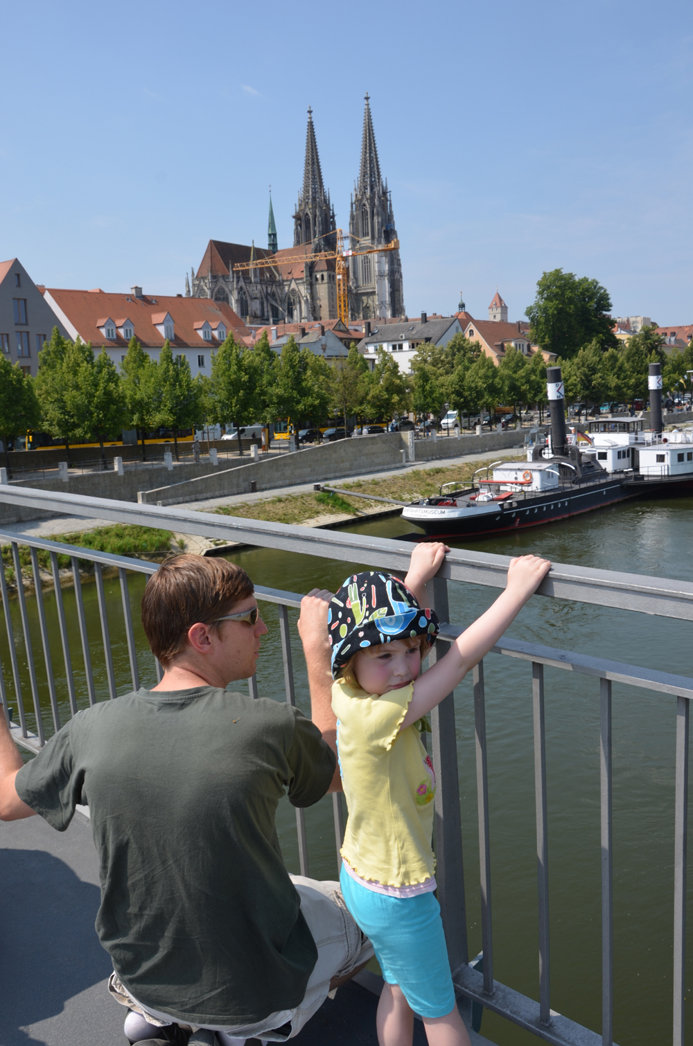 Bei sonnigem Wetter machten wir uns heute zu viert auf, Regensburg zu erkunden. Leider war es aber nicht Jasmins Tag, was vielleicht auch an den immer heißer werdenden Temperaturen und dem fehlenden Mittagsschlaf lag, sodass wir schon recht früh wieder nach Hause fuhren. Für eine ersten Eindruck der Stadt hat es aber dennoch gereicht. Johanna verschlief Teile des Stadtrundgangs, zeigte dann aber durchaus Interesse an der Architektur.
