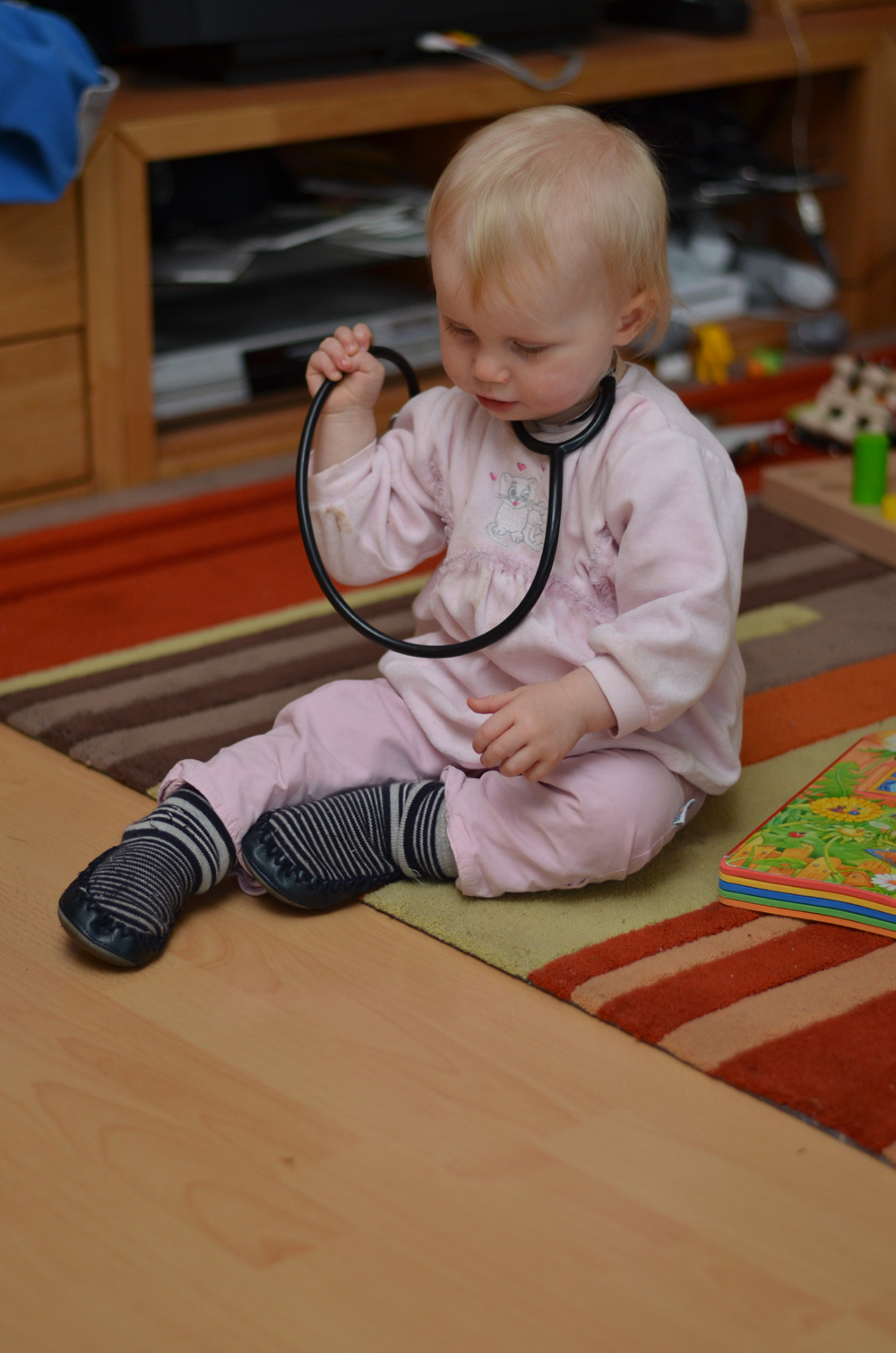 Johanna hat heute das Stethoskop aus der Spieleschatztruhe gefunden. Das fand sie auch recht interessant und fand sogar heraus, wie man das Ding fachgerecht trägt. Als sie es aber dann wieder ablegen wollte, wollte das nicht so ganz klappen. Da wurde Madame etwas ungehalten.