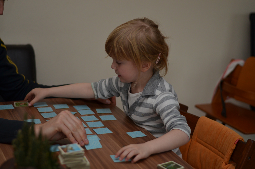 Heute wollte Jasmin mal wieder Memory spielen. Dabei hat sie sich ganz gut geschlagen, aber gegen einen Papa mit elefantösem Gedächtnis war heute zweimal kein Kraut gewachsen.