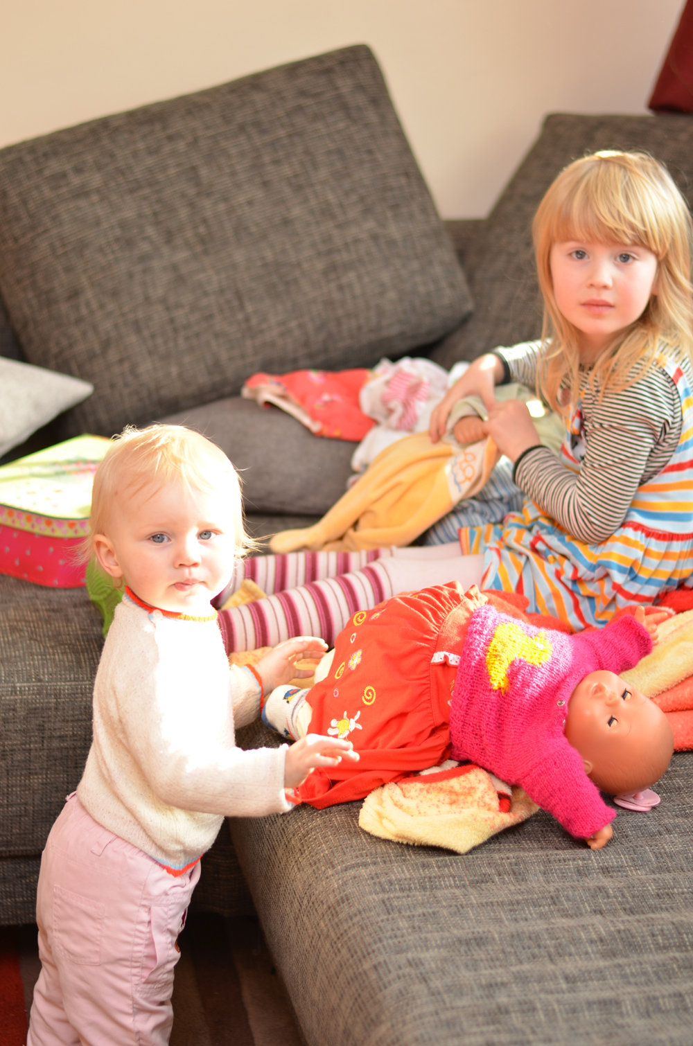 Inzwischen ist auch die kleine Schwester voll vom Puppenvirus infiziert. Jetzt wird öfters zusammen aus- und angezogen, gewickelt, gedrückt und umhergefahren. Es muss nur Einigkeit erzielt werden, wer die Mama von wem ist, dann läuft alles recht harmonisch ab. Das kann noch was werden in Zukunft…