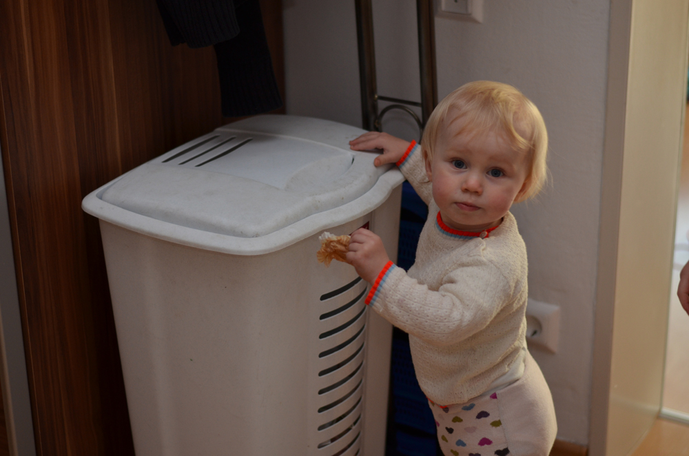 Johanna lässt sich inzwischen auch schon super zum Müllabtransport schicken. Zwischen Papierkorb und Gelbem Sack kann sich dabei schon ganz gut unterscheiden. Aber was wohin muss, hat sie noch nicht ganz durchschaut.