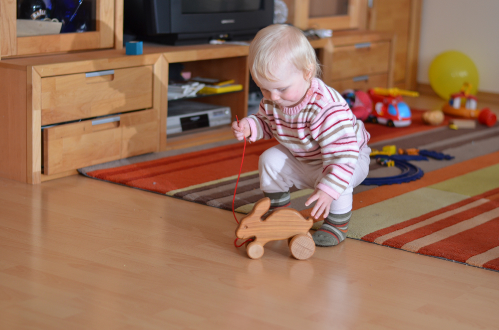 Johanna ist das erste uns bekannte Kind, dass voller Begeisterung “Hinterherziehspielzeuge” bestimmungsgemäß benutzt. Mit viel Elan und Ausdauer zieht sie den alten Hoppelhase durch die ganze Wohnung.