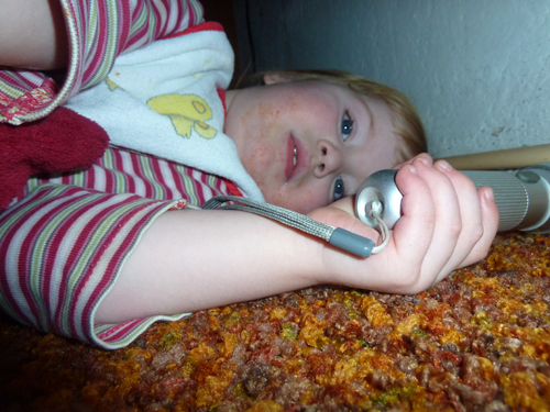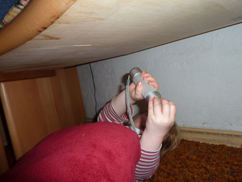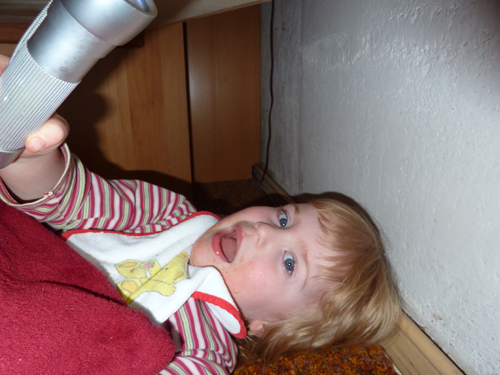 Nach dem letzten Abendessen 2011 wollte Jasmin unbedingt noch mal unter die Eckbank abtauchen. Während die Erwachsenen oben noch aßen und sich langweilig unterhielten, fröhnte sie ihrem Höhlendasein. Allerdings mit moderner Technik. Taschenlampe und Kissen sei dank wurde es sogar ganz heimelich da unten.