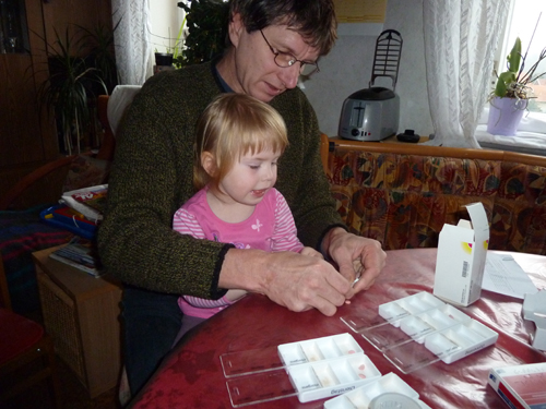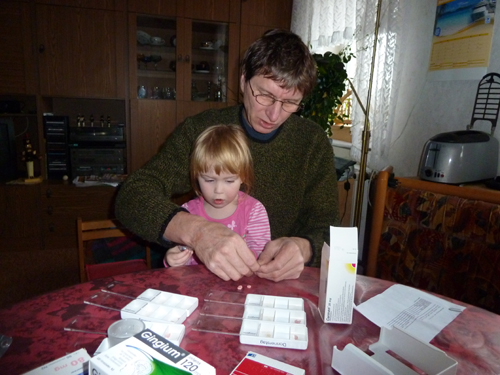 Einmal die Woche sortiert Opa die “Habletten” für die “Ticktackoma” für die ganze Woche. Ohne Jasmin geht das natürlich nicht. Viel zu interessant sind die ganzen bunten Dinger. Minchen sortiert alles in die richtigen Fächer, reiht die Boxen dann in die Wochenkiste ein und schmeißt alles leer gewordene am Ende in die Kellertasche.