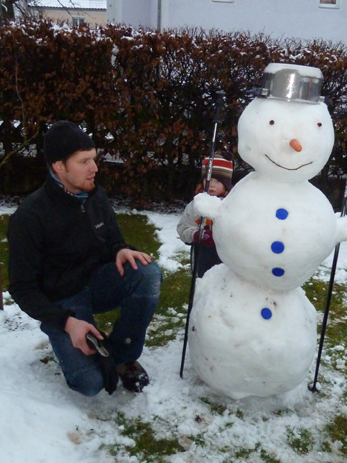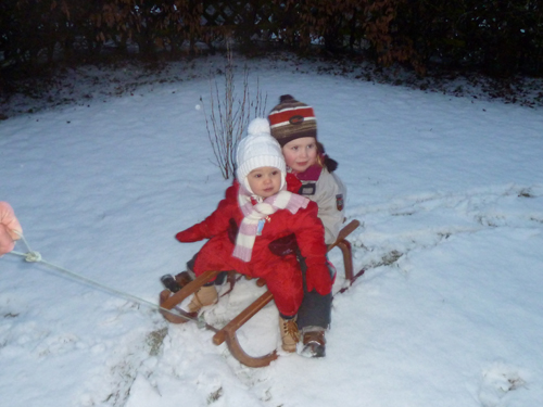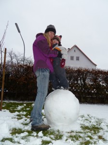 Heute hat’s endlich mal wieder ganz ordentlich geschneit. Und schon ging’s ab raus in den Garten. Nachdem ein akzeptabler Schneemann aufgestellt war, rollte sich Jasmin erstmal hemmungslos im Schnee. Später schloss sich dann auch noch unser neues Nachbarskind Paula an und räuberte fleißig mit. Bei der ersten Schlittenfahrt des Winters ging es dann mit geschätztem 0,1 PS- Antrieb durch den Garten bis es draußen dunkel wurde.