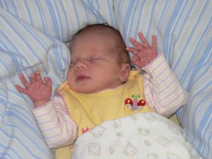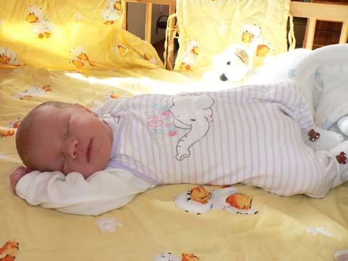Unsere kleine Johanna schläft derzeit noch die meiste Zeit. So wie hier sieht das dann meistens aus. Völlig entspannt verschläft sie die Zeit zwischen den Mahlzeiten.