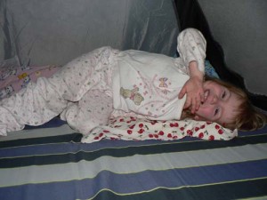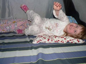 Lezte Nacht haben wir endlich unseren lange gehegten Plan in die Tat umgesetzt und draußen gezeltet. Jasmin fand es erwartungsgemäß super spannend. Einziger Kritikpunkt war, dass es noch etwas mehr hätte rascheln können. Naja, vielleicht beim nächsten Mal. Ansonsten lief alles gut. Minchen schlief einwandfrei händchenhaltend ein und wachte früh mit Kopf nach unten am Fußende wieder auf. Sehr trollig.