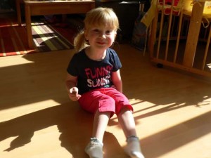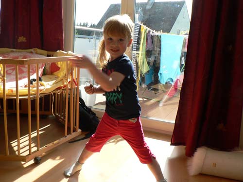 Johanna hat von Frau Forstner (die Papa in der Heilsbronner Zeit beherbergt hat) ein paar Klamotten für die Zeit nach dem Baby- und Wickelalter geschenkt bekommen. Damit die, solange der Windelpo regiert und Größe 110 noch in weiter Ferne liegt, nicht einstauben, trägt sie eben erstmal Jasmin. Steht ihr gut, gell?! Danke nochmal Frau Forstner!