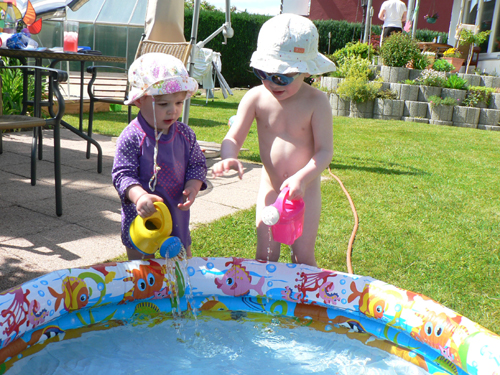 Bei dem heutigen heißen Sommerwetter blieb einem eigentlich nichts weiter übrig, als irgendetwas mit kühlem Wasser anzufangen. Das haben die beiden Mädels dann auch voller Freude gemacht und im heimischen Becken geplantscht, was das Zeug hält.
