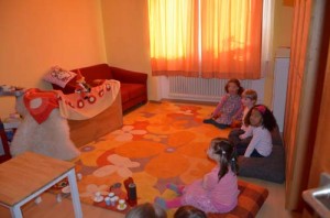 Nach dem Kaffe trinken folgte das Bewegungsspiel “Packerl auf, Packerl zu” (dazu müssen sich die Kinder, wenn das Päckchen zu ist, klein hinkauern, um dann, wenn das Päckchen aufgeht, verschiedene Dinge, z.B. hüpfende Frösche, darzustellen). Danach beklebten und bemalten die Kinder weiße Geschenktüten, in denen sie dann ihre Preise verstauen konnten: