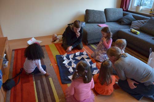 Zum Glück war das Wetter schön, sodass die Kinder auch noch etwas im Garten toben konnten, wo dann auch das Büchsen werfen (danke an Janka für die Büchsen!) stattfand. Wieder in der Wohnung jagten die kleinen Gäste dann Schmuggel-Schiffe, welche Goldmünzen geladen hatten. Dabei musste man sich aber merken, welches Schiff schon geplündert wurde, und wo noch etwas zu holen war (nach dem Falten von über 20 Papierschiffchen, kann die Mama das nun im Schlaf…)