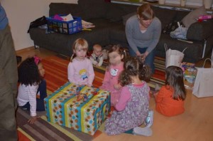 Nach dem Essen klingelte es dann plötzlich an der Tür und ein riesiges Paket mit einem mysteriösen Brief stand vor der Tür. Der böse Zauberer Hokus-Spukus hatte das Paket verzaubert, und die Kinder durften nur dann eine Lage Papier entfernen, wenn der Zauberwürfel die richtige Zahl zeigte. Nach ca. 20 Hürden, bestehend aus Einwickelpapier, Schleifen, Kartons etc. konnte der Schatz aber geborgen werden. Danach war der Tag auch schon zu Ende und zurück blieb ein Chaos in der gesamten Wohnung und vollkommen erschöpfte Mama, Papa, Johanna und Jasmin, wobei neben Jasmin auch Johanna super durchhielt und alles gespannt verfolgte.