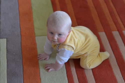 Seit einigen Tagen begibt sich Johanna immer öfters in den Vierfüßlerstand und versucht zu krabbeln. Vorwärts kommt sie dabei zwar noch wenig gezielt (am ehesten rückwärts), aber trotzdem bewegt sie sich immer mehr durchs Zimmer und ist immer wieder woanders zu finden.