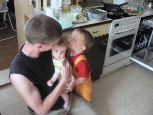 Über das Wochenende waren wir wieder einmal in Reinsdorf. Emma und Jonathan waren auch da und hatten viel Freude am Minchen. Beide ließen es sich dann auch nicht nehmen, dass Minchen abzuknutschen. Besonders Jonathan fand großen Gefallen an seiner Cousine. Nach anfänglichem zaghaften Händchen halten, konnte man ihn kaum noch vom Knutschen abbringen. Auch waren wir bei der Oma in Zwickau, die sich natürlich auch gefreut hat, dass Minchen endlich wieder zu sehen. Aber nicht nur die menschlichen Verwandten zeigten Interesse am Baby: Auch das neue Familienmitglied Morle zeigte reges Interesse an Jasmin und ließ sich trotz kurzem Geschrei und einiger Tritte vom Baby nicht aus dem Laufgitter vertreiben. Sie spielte dann sogar mit der Kleinen, blieb dann bei aber ganz lieb und ließ die Krallen drinnen.