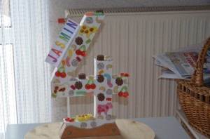 Das Feiern von Minchens viertem Ehrentag scheint kein Ende zu nehmen: Zu Besuch bei Oma und Opa wurde noch einmal nachgefeiert. Besonders beeindruckend war die selber gebastelte und von Opa mit Süßigkeiten verzierte große Vier. Emma und Jonathan durften selbstverständlich mitnaschen. Begeisterung fand aber natürlich auch das Geschenk in Form einer Karete für die Puppe.