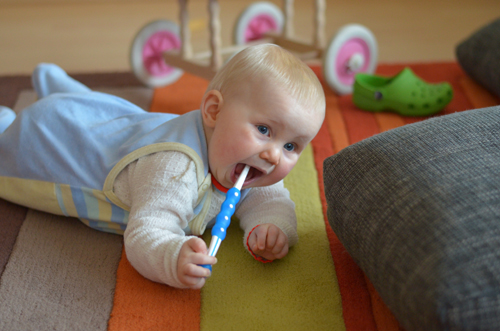 Seit Johanna Bärchenzähne hat, inzwischen sind es übrigens stolze vier, wird natürlich auch fleißig geputzt. Glücklicherweise lässt sie sich das bisher gut gefallen und hat sogar eine sehr innige Beziehung zu ihrer Zahnbürste entwickelt.