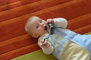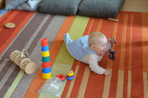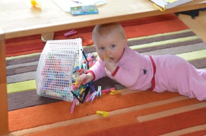 Heute waren wir, diesmal aber ohne Minchen, wieder beim Pekip. Einige der anderen Babys können seit Neuestem Robben. Johanna hat sich das genau angeschaut und zu Hause dann gleich ausprobiert. Und sie kommt tatsächlich vorwärts, indem sie sich mit ihren Wurstärmchen vorwärts wuchtet und den Rest hinterherschleift. Mit ihrer neuen Fähigkeit geht sie aber noch recht sparsam um und setzt sie nur dann ein, wenn sie sich etwas Interessantes schnappen möchte, wie Mamas alten Fotoapparat oder den Klammerkorb. Toll ist natürlich auch, wenn es etwas einzureißen gibt.