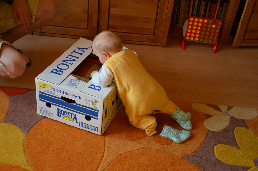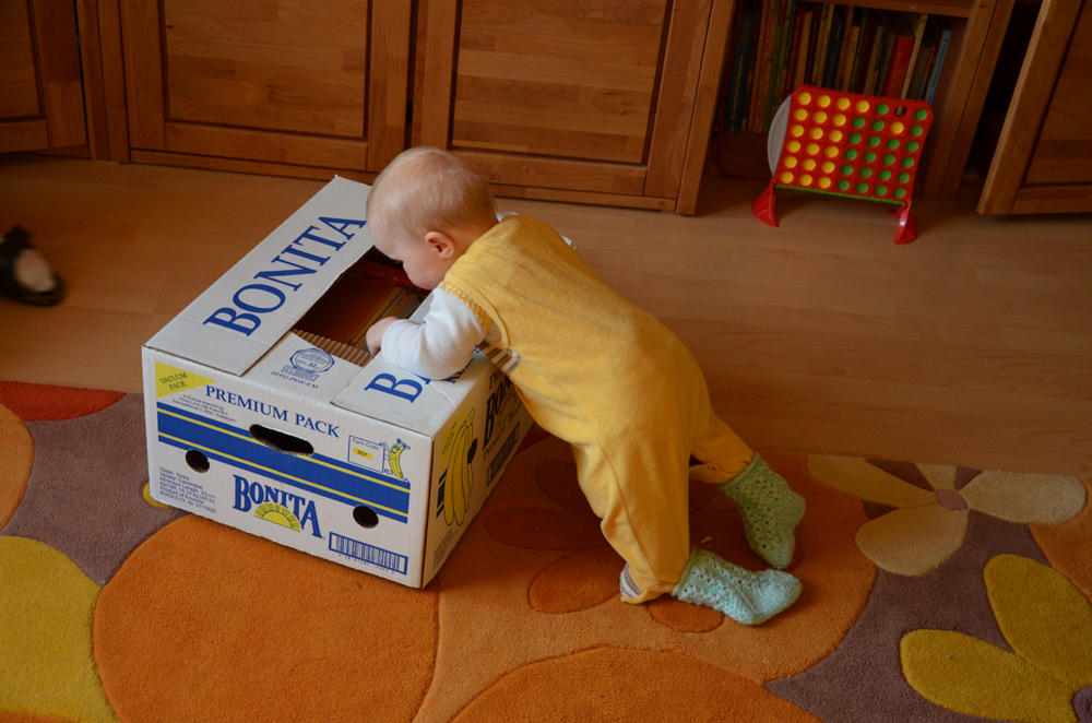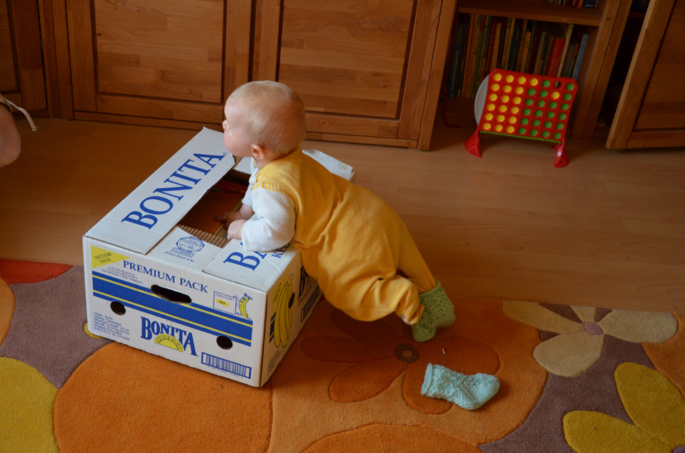 Nach unserer Rückkehr aus dem Tierpark überraschte uns Johanna damit, dass sich die kleine Neugiersnase an einem Karton hochzog und dabei hinstellte, am Ende sogar ganz lässig auf einem Bein. Man wollte natürlich erkunden, was sich in dem Karton verbirgt. Etwas wackelig ist sie zwar noch unterwegs und kugelte auch ein paar Mal umher, aber wir sind sehr beeindruckt.