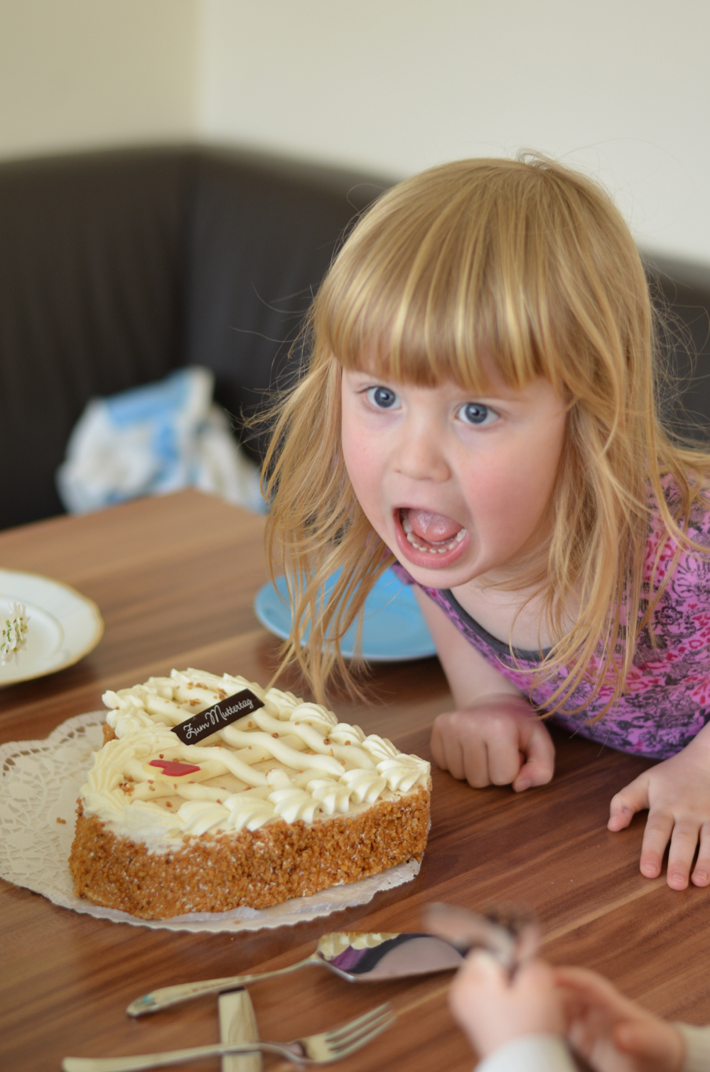 Zum Muttertag überraschten Minchen und Papa die Mama mit einem leckeren Kuchenherz und super selbst gemalten Bildern. Auch wenn das Foto etwas anderes vermuten lässt, bekam die Mama vom Kuchen sogar etwas ab.