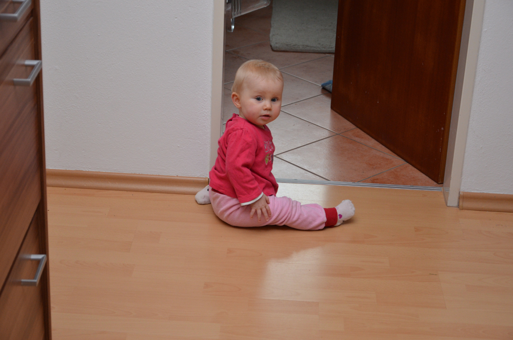 Johanna hat die unterschiedlichsten Varianten entwickelt, um sich hinzusetzen. Diese Sitzposition wurde von Jasmin nicht ganz zu unrecht mit Babyspagat getauft.