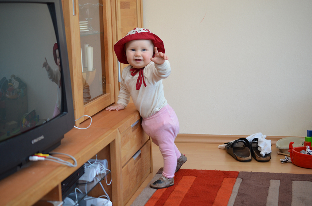 Johanna zeigt jetzt immer wieder auf ihr bekannte Personen, wie Jasmin oder Mama und Papa. Neu sind auch ihre ersten Schühchen (da sie sich die Socken immer runterstrampelt), obwohl wir versuchen, die Maus so oft es geht barfuß frei zu lassen.