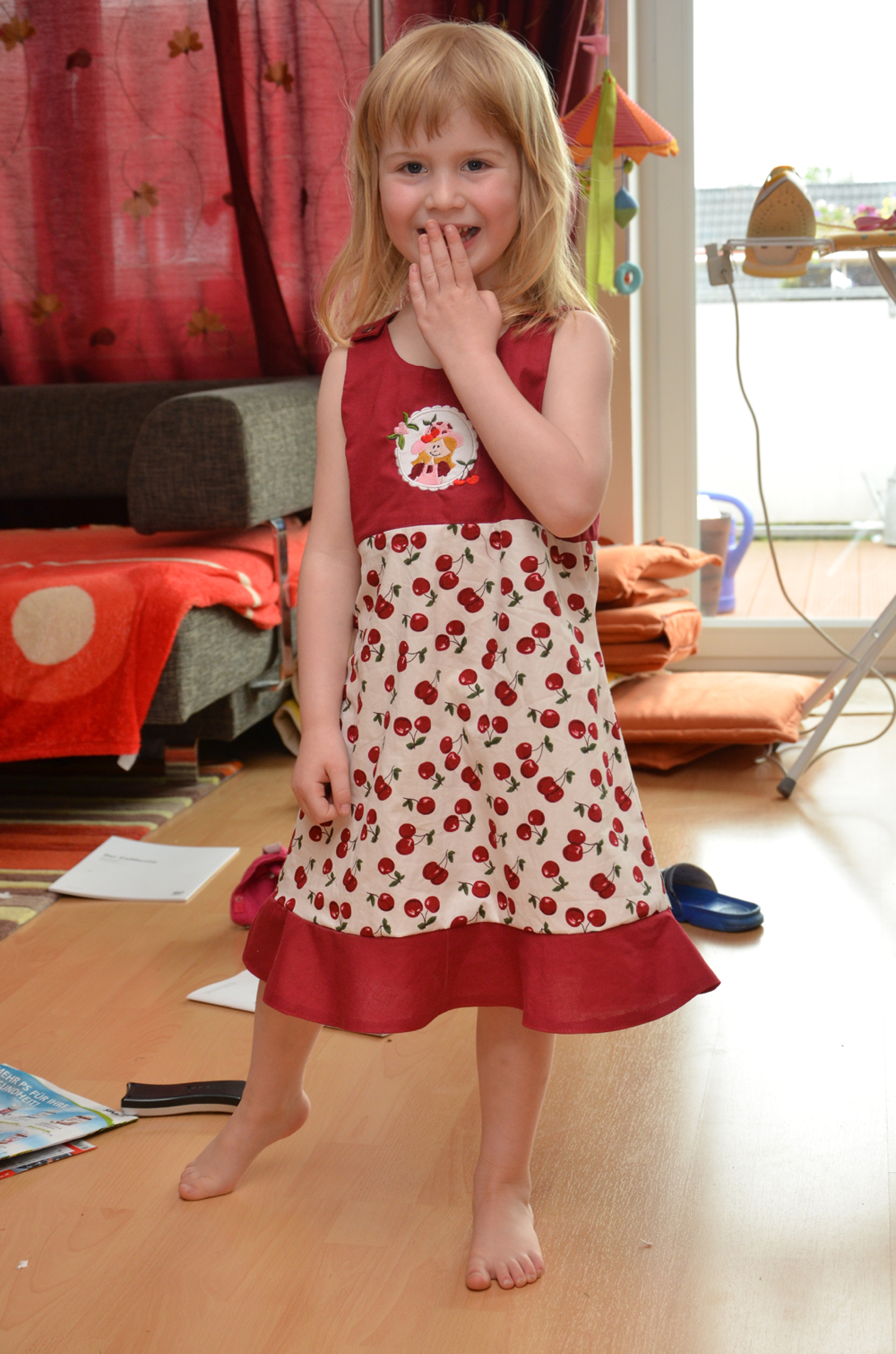 Hier nun das Kleidchen am lebenden Modell. Ist noch etwas reichlich, aber sieht trotzdem schon sehr süß aus, finden wir.