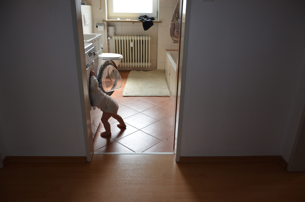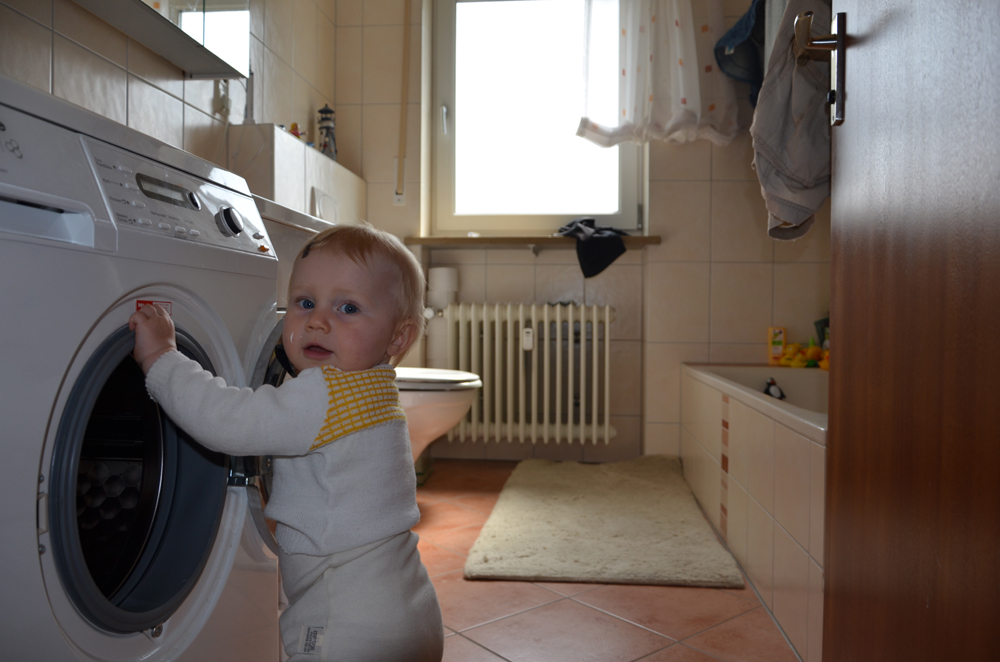 “Prüfe Dosierungsempfehlung” zeigt unsere Waschmaschine an, wenn mal zu viel in der Trommel ist. Heute wäre es fast wieder mal so weit gewesen. Doch dann kam der kleine Lümmel wieder aus der Trommel. Irgendwas hatte sie vorher darin versenkt, was sie nun wieder in Händen hielt.