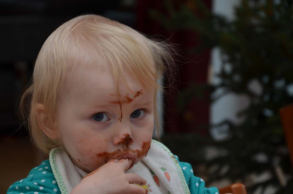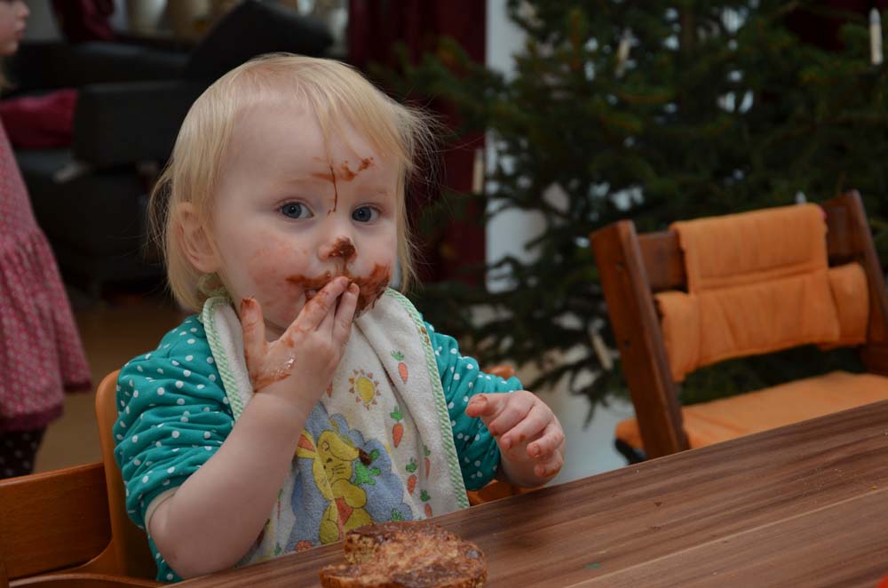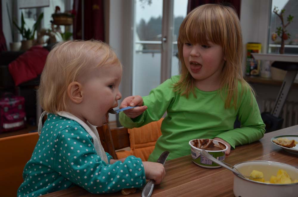 Ernährungsberater weggeschaut: Johanna hat in letzter Zeit den Frischkäse- Schokoaufstrich für sich entdeckt. Wenn der auf dem Tisch steht, ist an ein geordnetes Essen nicht mehr zu denken. Deshalb kommt er immer erst gegen Ende zum Einsatz. Wenn Johann dann einen Löffel mit der süßen Versuchung bekommt, kann sie erstmal gar nicht essen, weil sie breit grinsend und völlig glückselig sekundenlang auf ihrem Stuhl hin und her rutscht.