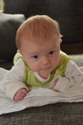 Das Köpfchenhalten funktioniert nun immer besser. Frederik zeigt sich auch zusehends motivierter eine Zeitlang auf dem Bauch zu liegen ohne in Schimpfen zu verfallen Mit so aufrechtem Kopf wirkt der Kleine schon richtig groß!