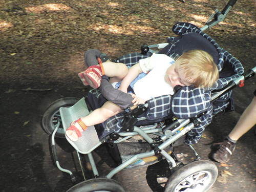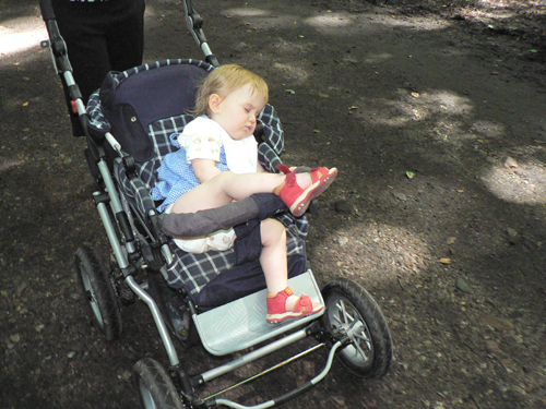 Nachdem wir die Kreidefelsen besucht haben, dauerte Jasmin der Weg zurück zum Auto wohl etwas zu lange – von der anstehenden Autofahrt ganz zu schweigen. Also machte sie ihren Mittagsschlaf kurzerhand im Kinderwagen. Das Bein war vom vorherigen Rumalbern noch auf dem Bügel und blieb so, bis Madame irgendwann wieder erwachte.