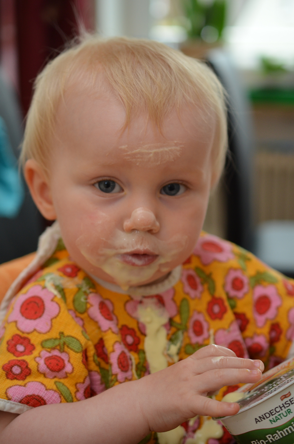 Unbeobachtete Momente nutzt Johanna hin und wieder zu sonst verbotenen Dingen. Stutzig sollten die Erwachsenen eigentlich immer gleich werden, wenn absolute Ruhe herrscht, denn dann ist das Chaosbärchen meist am Werk. Heute erwartete die zurückkommende Mama ein Baby mit Joghurt – und einem leeren Joghurtbecher (der eben noch voll und verschlossen war).